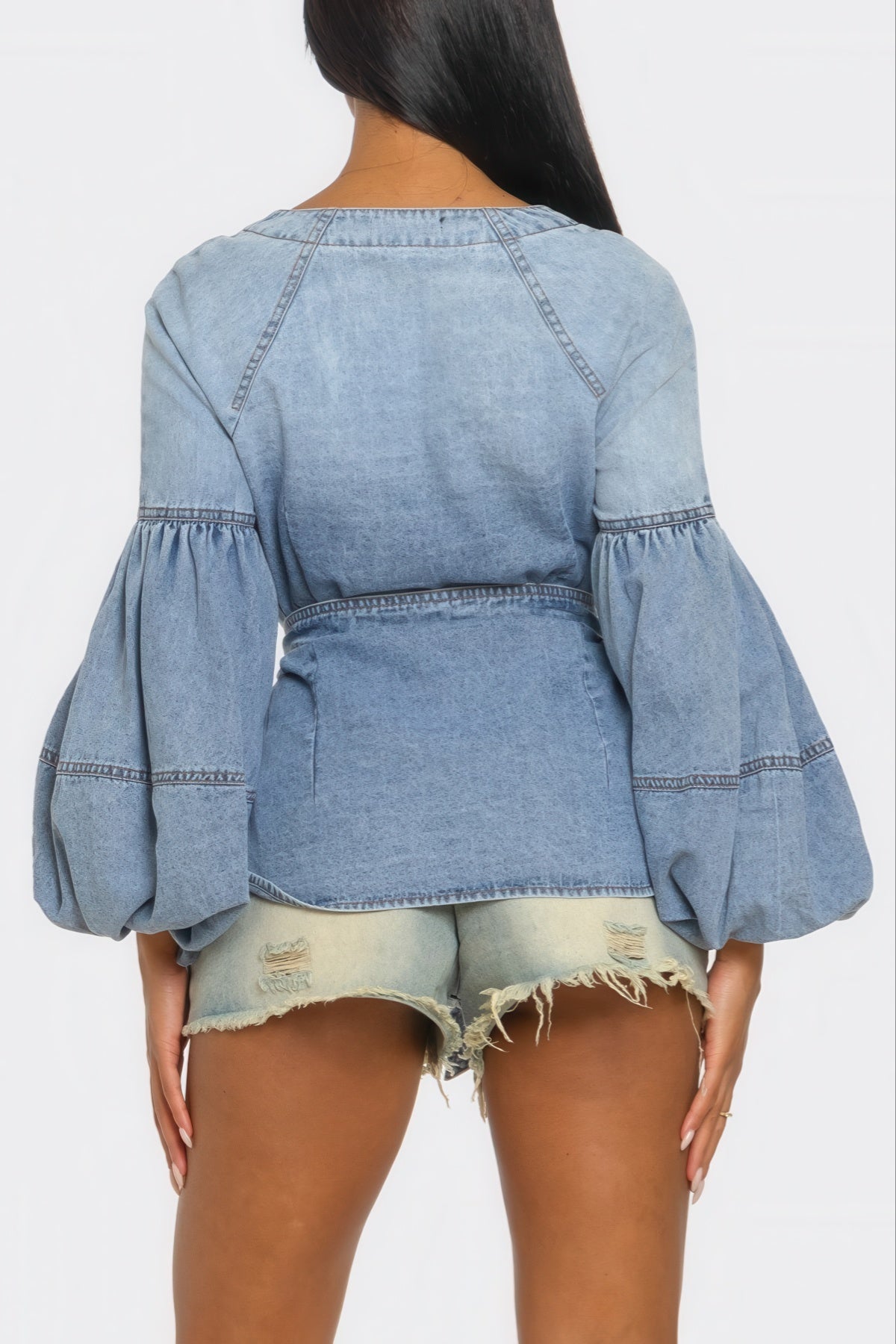 A statement take on denim, this blouse features voluminous balloon sleeves that bring elegance to a casual staple. Designed with a flattering V-neckline and a belted waist, it cinches in just right for a feminine silhouette. The snap-button front adds a touch of utility, balancing the dramatic shape with everyday ease. Softly washed denim gives it a vintage-inspired look that pairs beautifully with shorts, skirts, or trousers. Perfect for casual outings or elevated street style, this top effortlessly blends structure with movement.