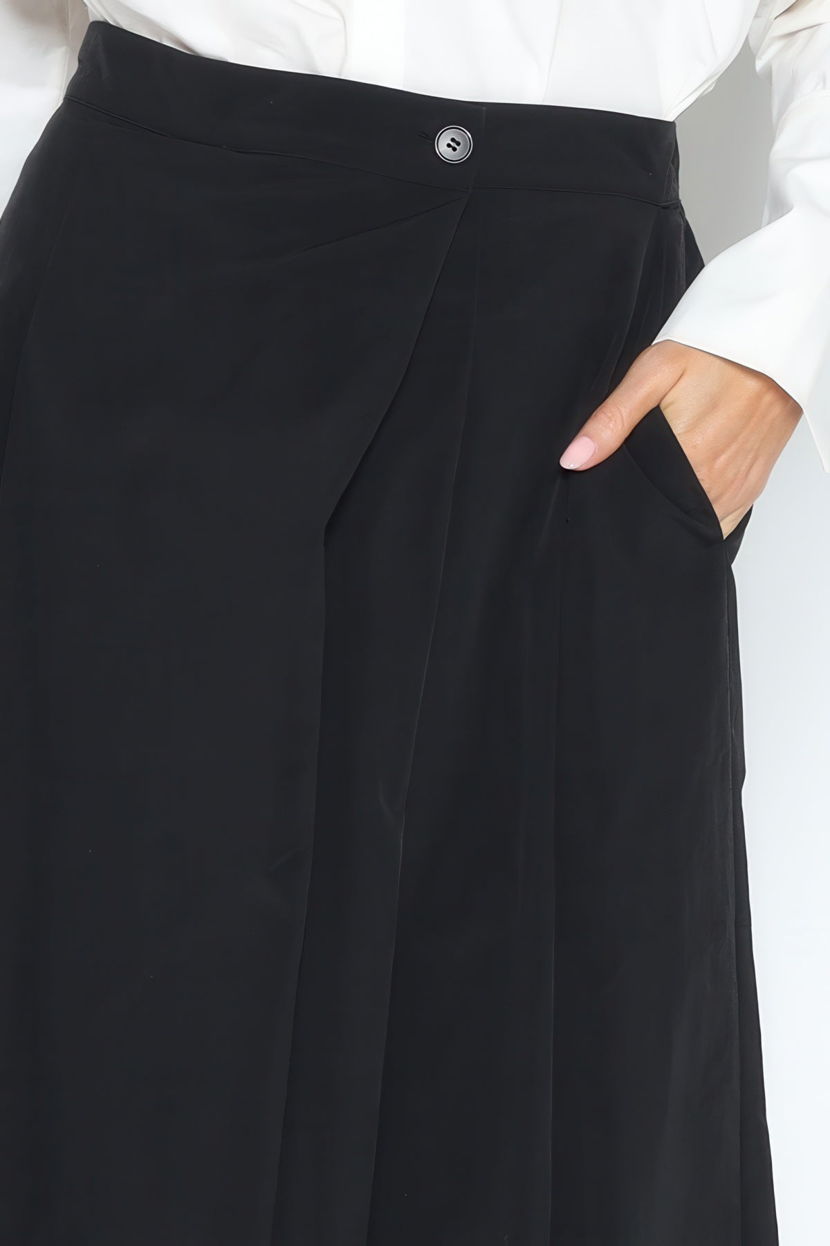 Who says you can't have the elegance of a skirt with the freedom of pants? These wide-leg culotte pants give the illusion of a flowing midi skirt while delivering the comfort and practicality of trousers. Made from a lightweight, breathable fabric, they feature a sleek wrap-over front, hidden wide-leg design, and a flattering high waist with back elastic for ease. Whether you're strolling through the city or headed to brunch, these pants move with you—gracefully and confidently. The side pockets are the cherry on top, adding function to fashion. Pair them with heels or sneakers for a look that always feels right.