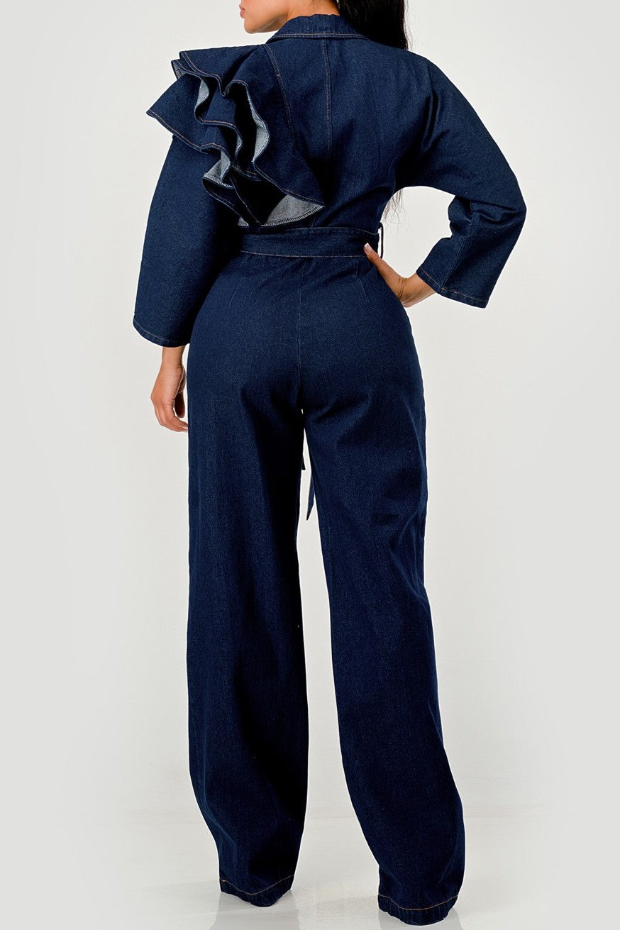 Turn heads the moment you step out in this bold and beautifully structured denim jumpsuit. Crafted in a deep, rich indigo wash, this one-piece brings together confidence, elegance, and attitude all in one statement outfit. The dramatic plunging neckline adds instant allure, while the layered ruffle detail along one shoulder gives you that high-fashion edge without even trying. Its wide-leg silhouette elongates your frame effortlessly, and the adjustable waist tie cinches you in just right for a flattering, feminine shape. Perfect for a night out, brunch, or any moment you want to stand out. Slip it on and watch the compliments follow.