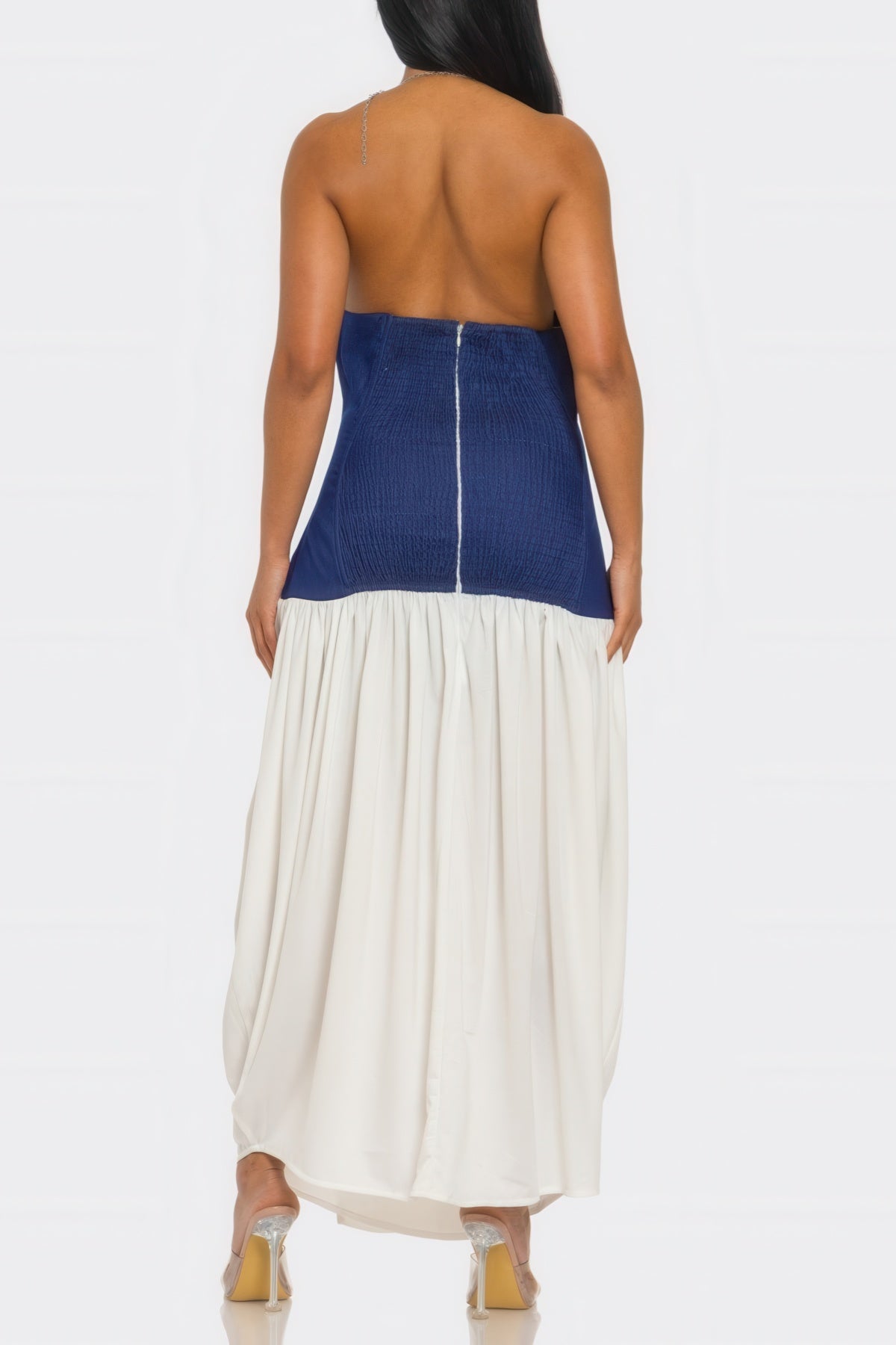 Command attention in this bold contrast maxi dress that effortlessly blends edgy structure with goddess-like flow. The denim-inspired bodice hugs your curves with a sculpted fit, while the plunging neckline and delicate chain halter detail add a daring dose of glamour. Below, a cascade of soft white pleats brings balance and movement, creating a breathtaking silhouette that’s both statuesque and sensual. From rooftop parties to summer soirées, this dress is your ultimate power piece.