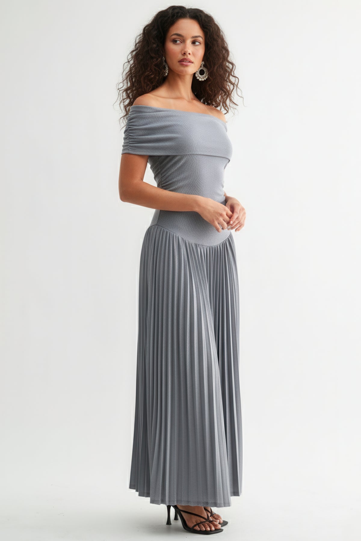 This slate-blue off-shoulder gown is where timeless beauty meets modern grace. Designed with a softly draped neckline that flatters the shoulders and a fitted bodice that flows into a pleated, floor-length skirt — every detail speaks sophistication. The lightweight, silky fabric moves effortlessly with each step, creating an ethereal, floating effect. Perfect for evening soirées, weddings, or any occasion that calls for quiet glamour. Slip it on and let your presence do the talking.