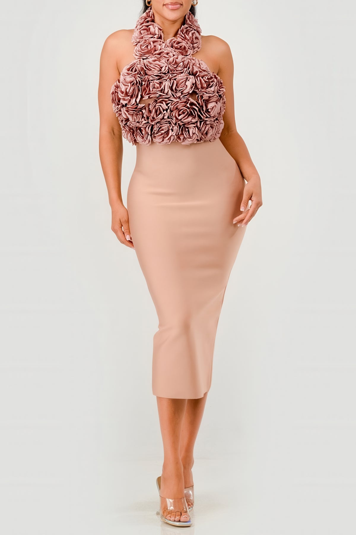 This stunning midi dress is designed to make a statement the second you walk in. The body-hugging silhouette sculpts your curves with a smooth, seamless finish, while the soft apricot tone adds an elegant, feminine glow to your look. The true showstopper? A dramatic 3D floral halter neckline, crafted with layers of plush rosettes that frame your décolletage and cascade beautifully across the bodice. A back slit adds just the right amount of movement, keeping the look classy, modern, and irresistibly chic. Perfect for weddings, galas, birthdays, or any night that deserves a jaw-dropping entrance.