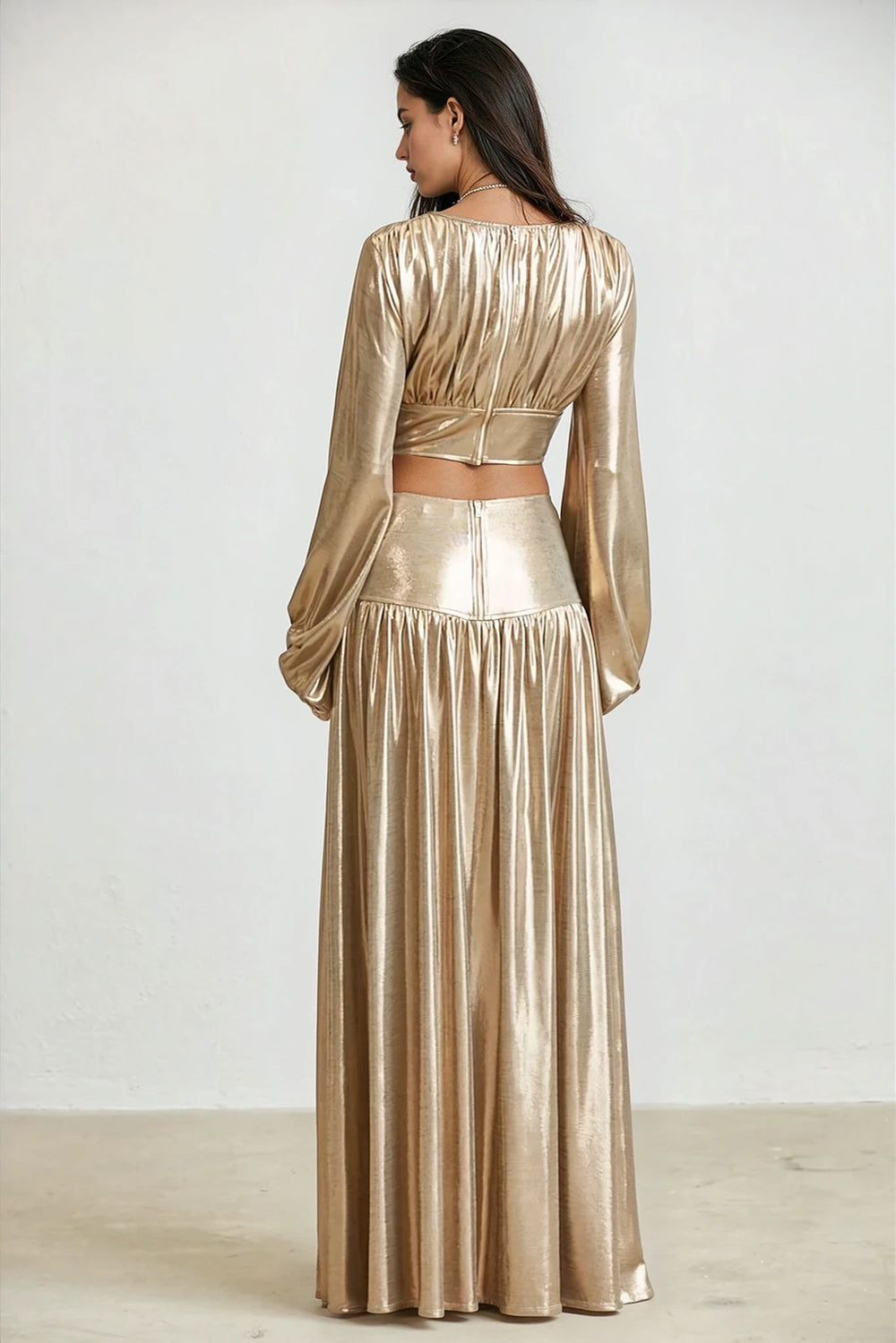Turn heads and own the spotlight in this dazzling metallic two-piece set. The long-sleeve crop top features a gathered neckline with a flattering fitted bust, paired with voluminous sleeves for a chic yet dramatic touch. The high-waisted maxi skirt flows effortlessly, catching the light with every step for a goddess-like glow. Crafted in a radiant gold metallic finish, this set is perfect for glamorous nights out, special occasions, or when you simply want to make a bold entrance. Slip into this show-stopping look and let your confidence shine as brightly as your outfit.