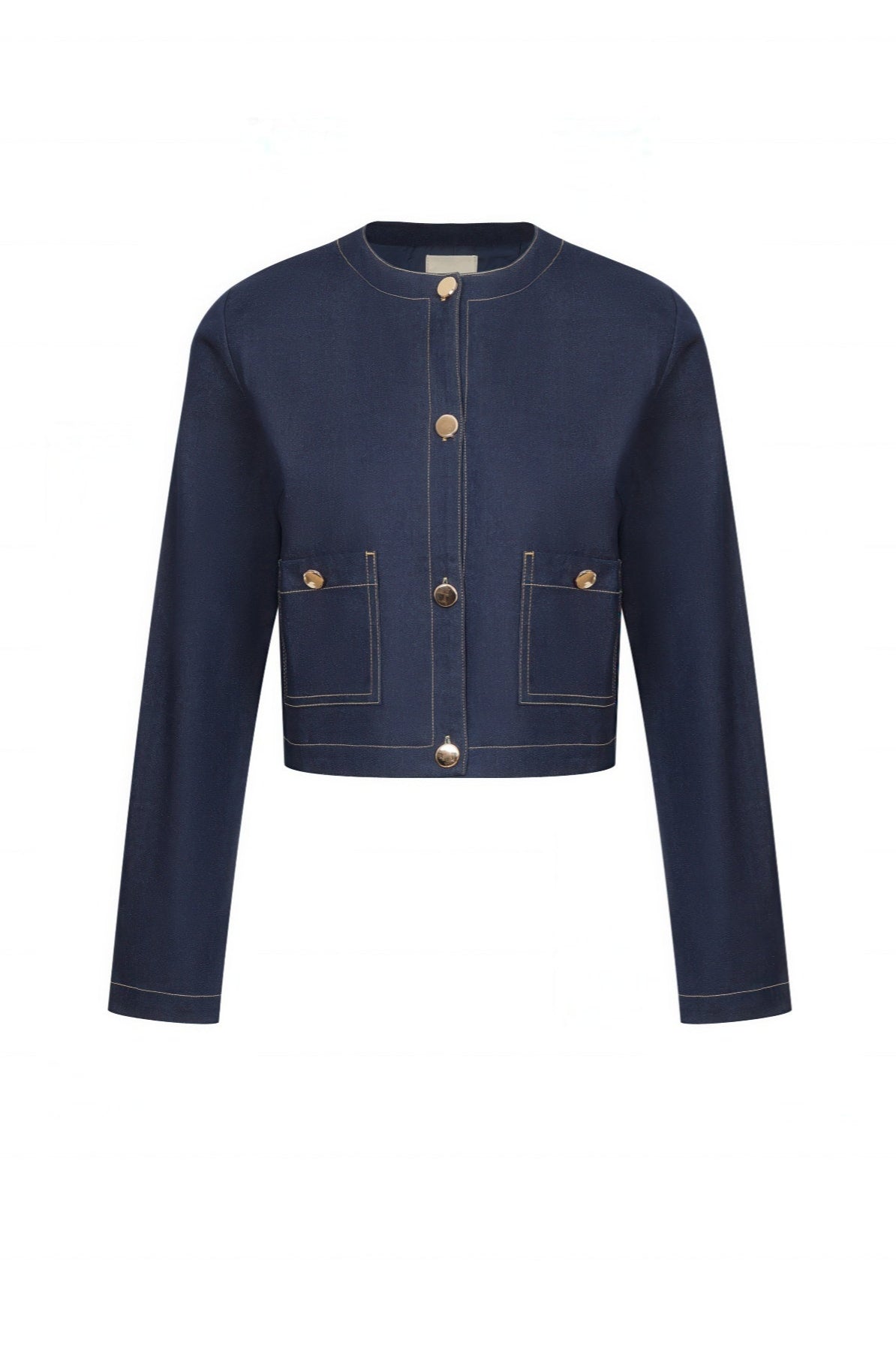 This cropped jacket-style top is where structure meets style. Crafted in a rich indigo wash with bold contrast stitching, it’s finished with polished gold-tone buttons and front pocket details for that elevated utility feel. The clean lines and boxy cut make it a versatile layering piece—wear it with tailored trousers for a polished office look or pair it with denim for an effortlessly chic weekend vibe. Whether buttoned up or left open, this top adds a modern edge to your wardrobe staples.