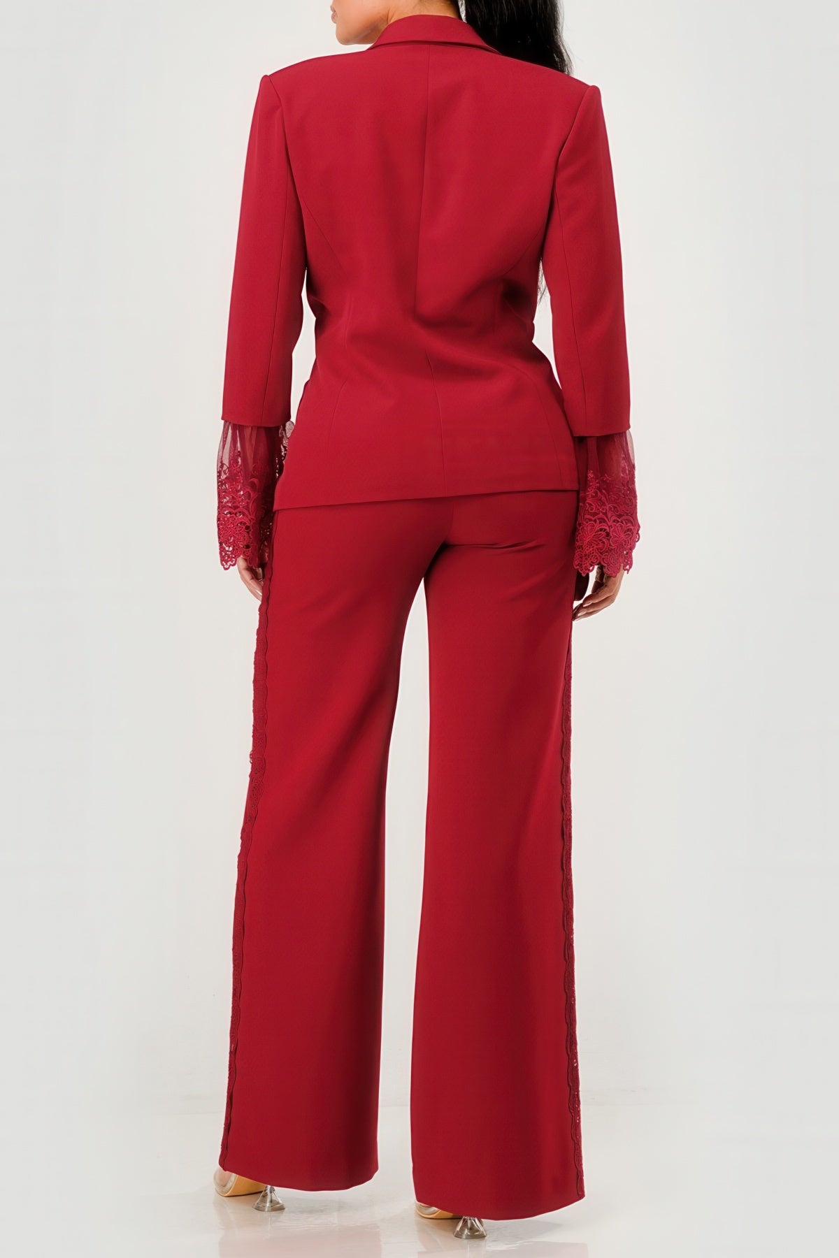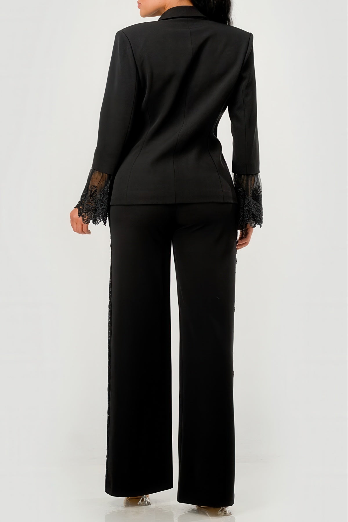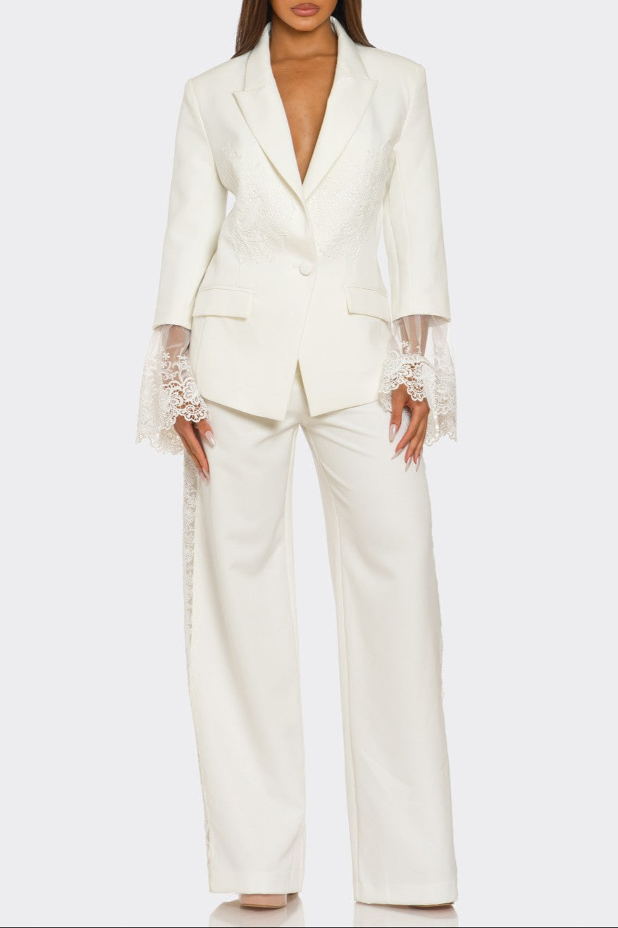 Make elegance your statement in this two-piece set that brings couture energy to the classic power suit. This tailored blazer features delicate lace embroidery and sheer mesh cuffs with scalloped lace trim—an unexpected, romantic twist to structured sophistication. Paired with wide-leg trousers that subtly incorporate matching lace along the sides, this set is all about balance: bold yet feminine, commanding yet graceful. Perfect for bridal events, upscale evenings, or when you simply want to own the room.