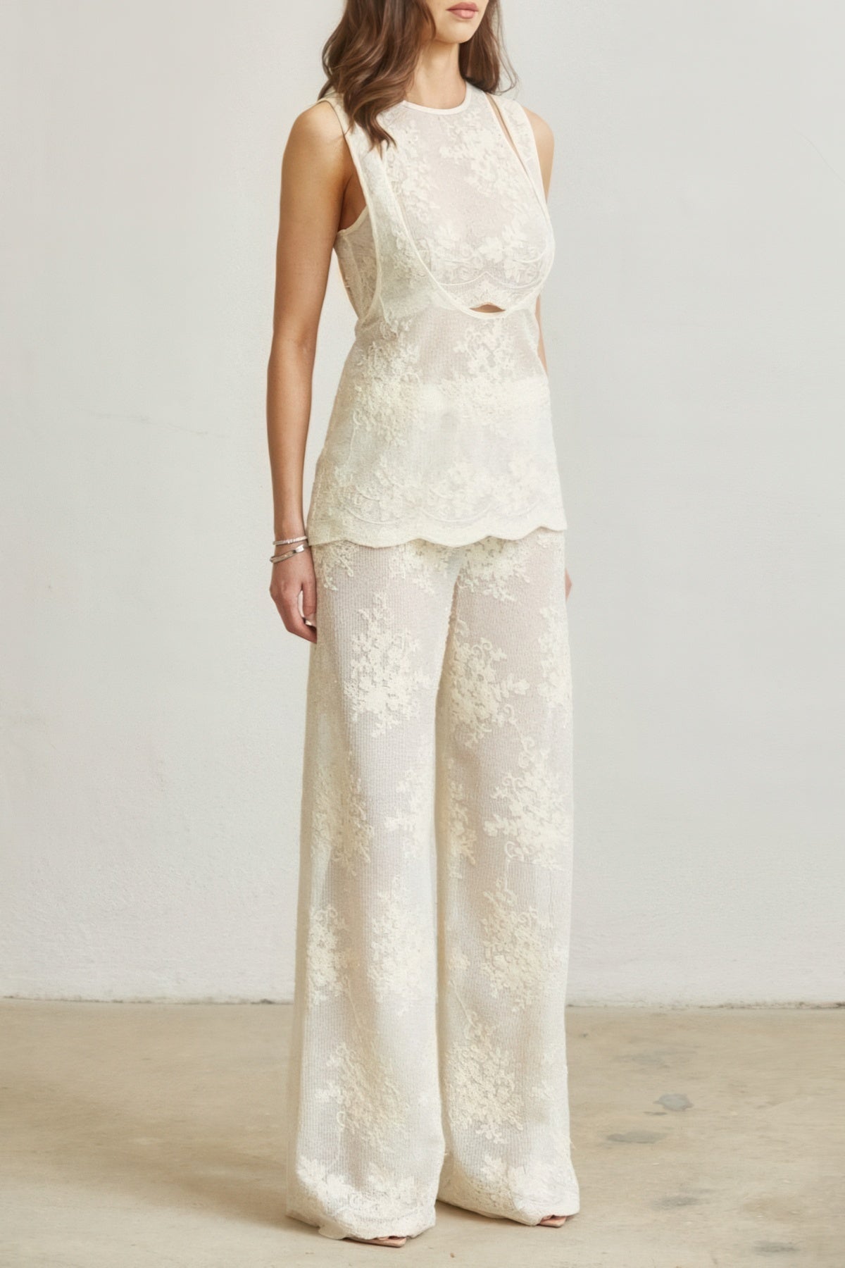 Slip into something unforgettable with this breathtaking lace set that’s as romantic as it is refined. The sleeveless top features an elegant scoop-back silhouette and delicate floral embroidery, layered over a sheer mesh canvas for a soft yet sultry finish. Matching wide-leg pants echo the lace motif, offering graceful movement and a figure-lengthening shape. Every detail, from the scalloped hem to the dreamy texture, whispers effortless sophistication. Whether you're headed to an upscale brunch or an intimate garden soirée, this look guarantees all eyes on you.
