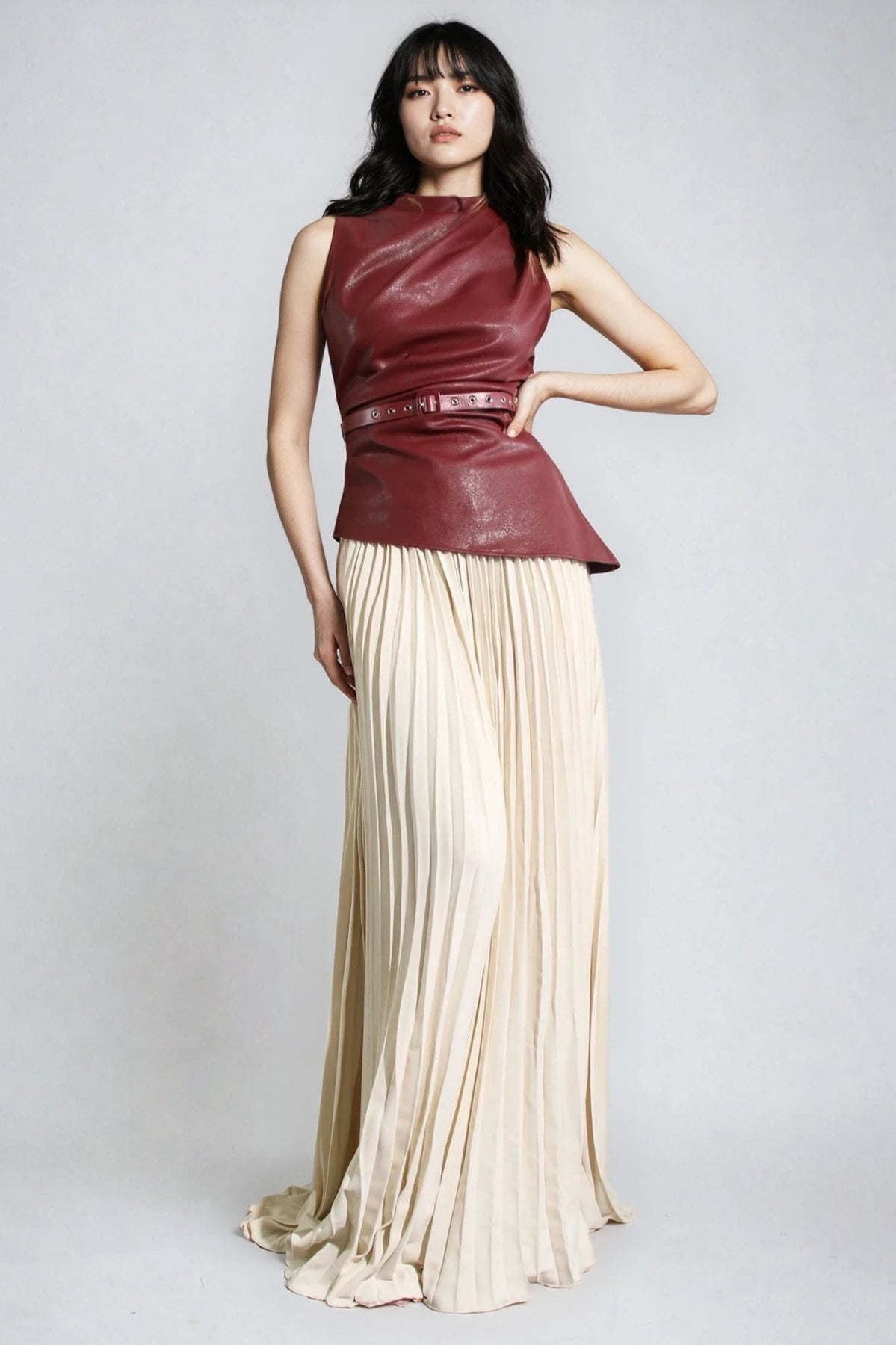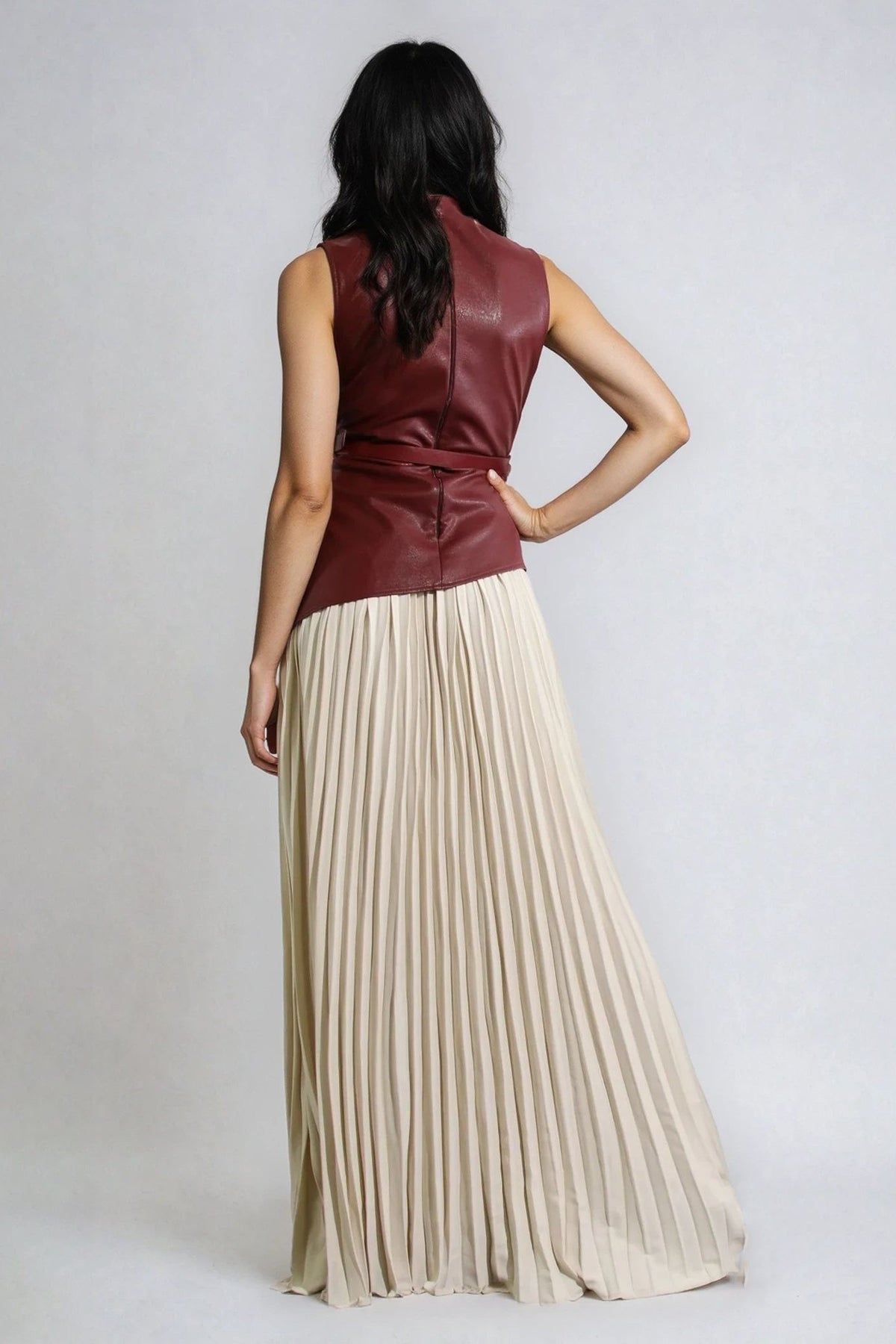 This two-piece set is the definition of refined boldness — pairing a sleek faux leather wine-toned top with a flowing pleated cream maxi skirt. The asymmetrical cut and belted waist sculpt your shape while adding modern structure. The soft, lightweight pleats move gracefully with every step, balancing the strong leather texture with feminine flow. Perfect for a dinner soirée or a statement event, this set redefines sophisticated contrast — powerful, poised, and effortlessly chic.