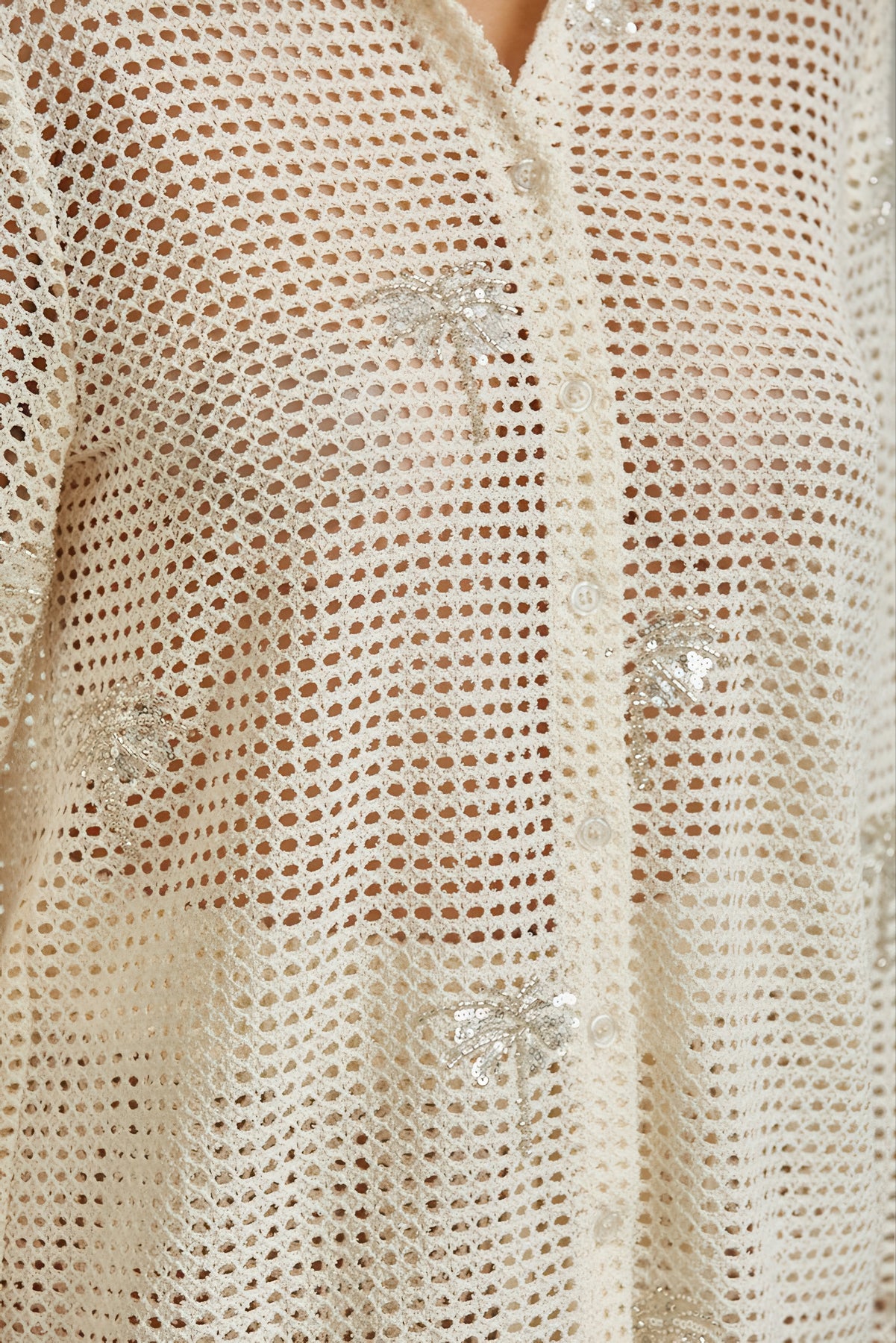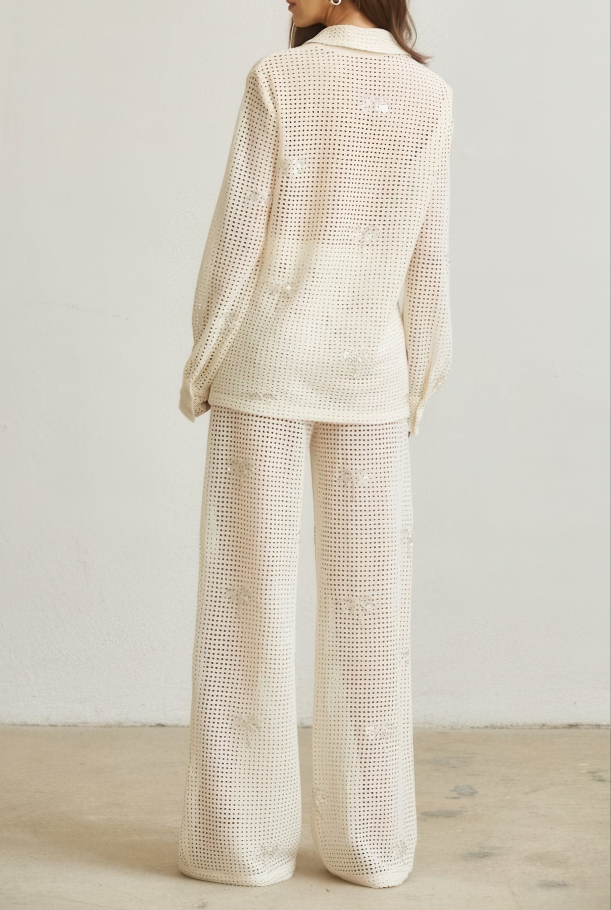 Why just lounge when you can shimmer? This airy, open-knit set is vacation-ready and designed to dazzle with every step. The relaxed button-down top and wide-leg pants are embroidered with delicate, silver sequin palm trees—each one catching the light like a beachside sunset. Sheer but sophisticated, the breathable mesh fabric creates a barely-there look that’s perfect for layering over swimwear or styling for rooftop cocktails. It’s all about breezy silhouettes, luxe textures, and island-girl energy.