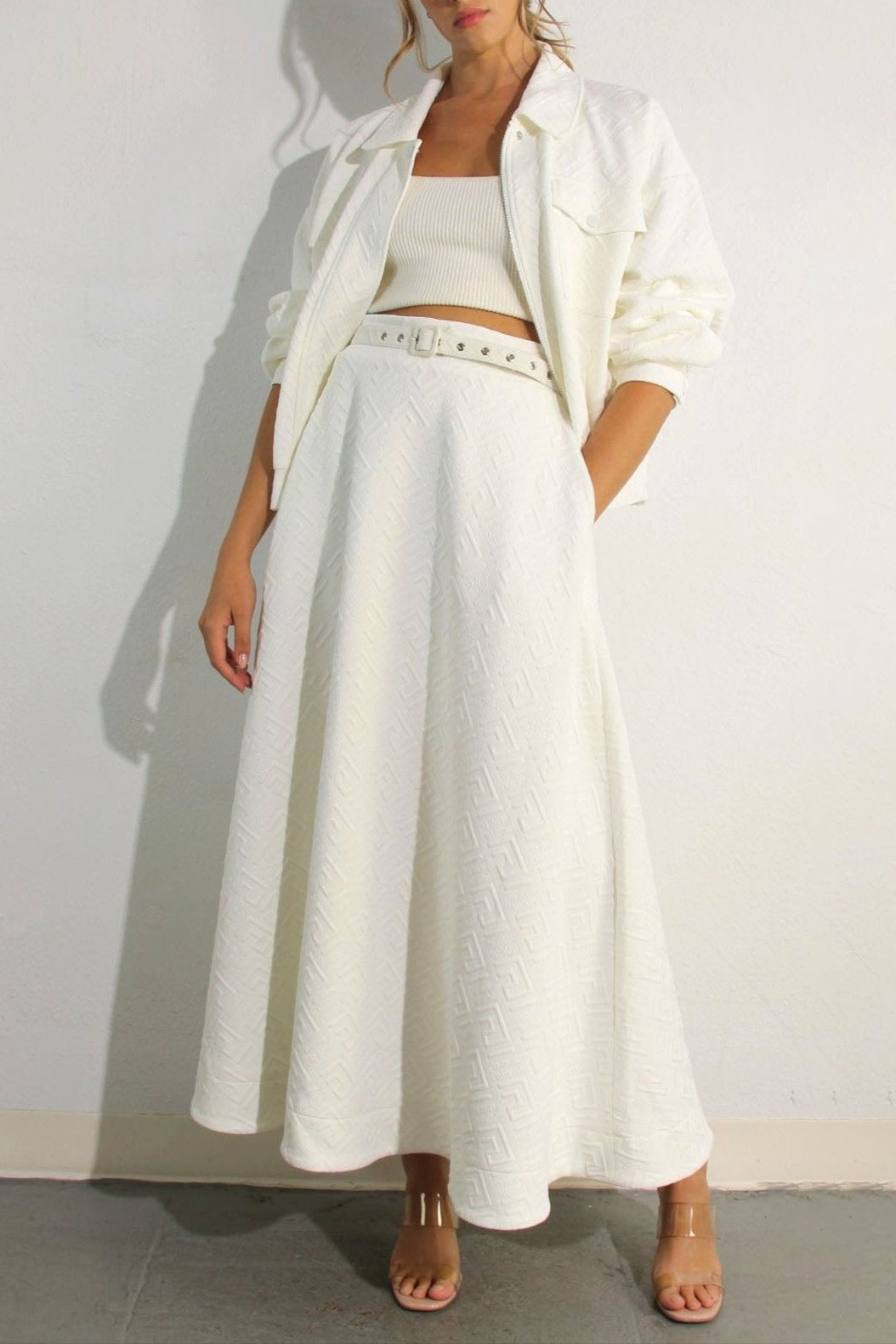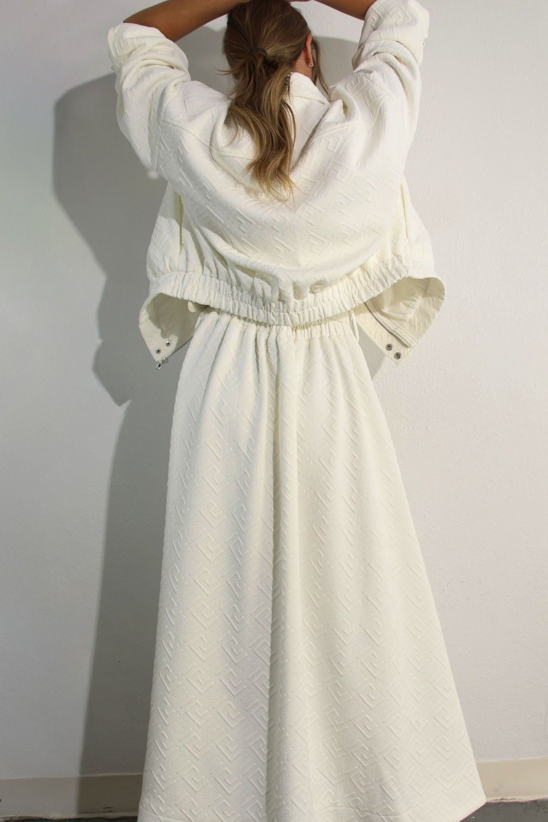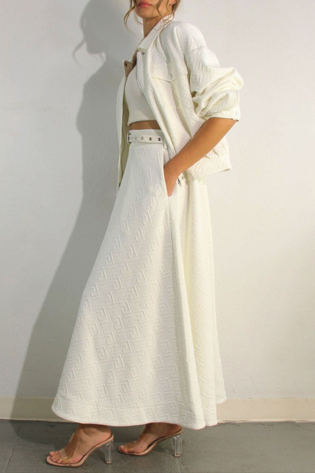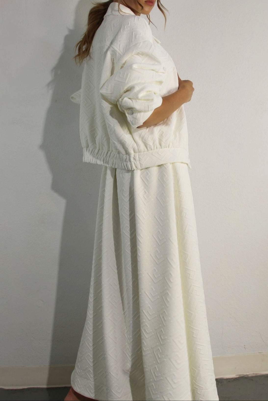 This elegant two-piece set is the epitome of understated sophistication. Crafted in a soft, creamy white fabric, the ensemble features an intricately textured geometric pattern that adds depth and character to its minimalist design. The cropped jacket exudes effortless chic with its relaxed fit, front snap-button closure, and structured collar, offering a polished yet casual vibe. The matching maxi skirt flows gracefully to the ankles, creating a flattering A-line silhouette enhanced by a subtle elastic waistband for added comfort and fit. Complete with functional side pockets, this set is as practical as it is stylish. Perfect for a day out or a casual evening event, this ensemble combines versatility and elegance seamlessly.