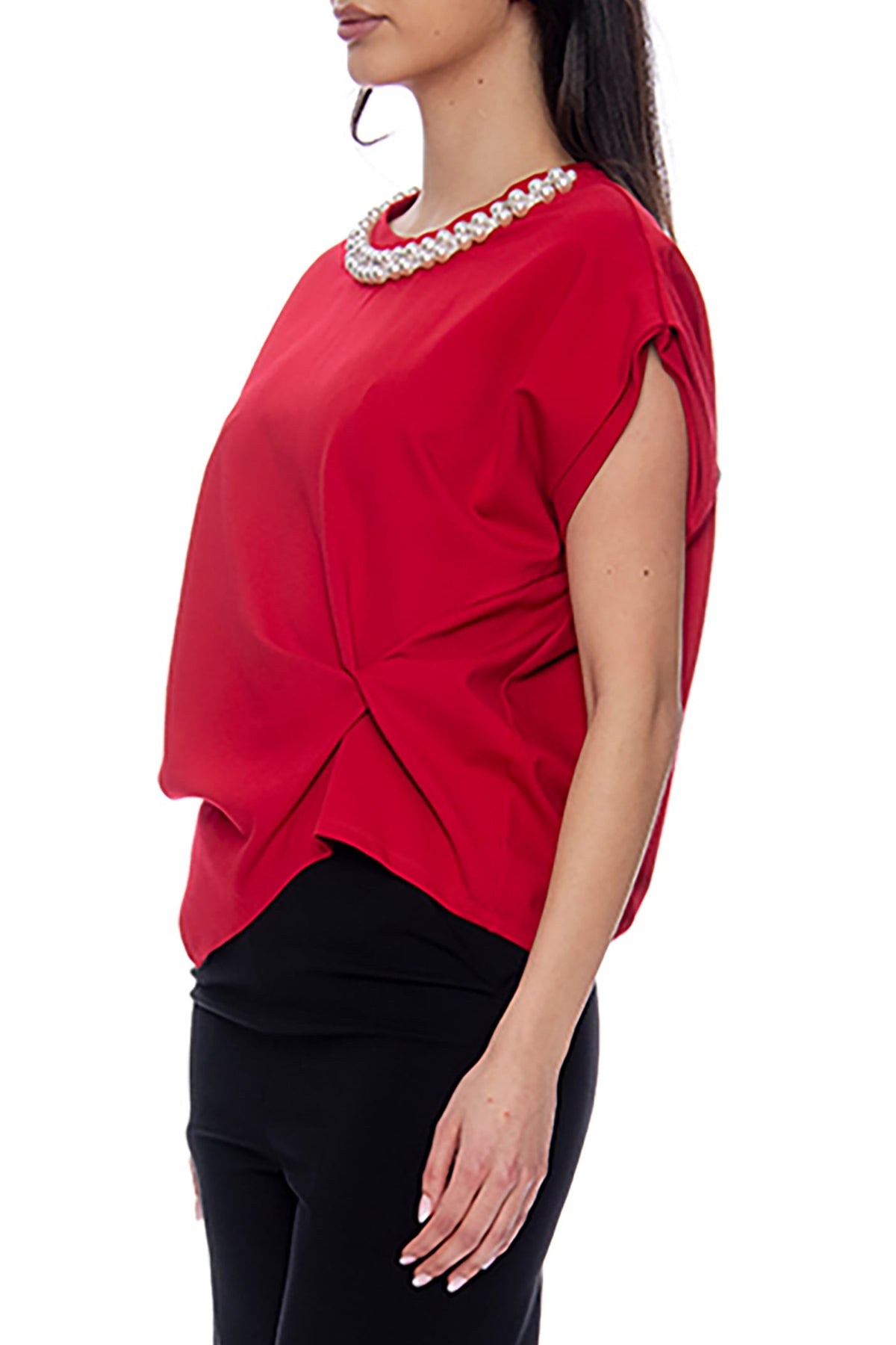 “Set the Scene in Pearls”—because a little drama (and a lot of sparkle) never hurt anybody! This striking top is all about statement-making details: a lavish beaded neckline that catches the light beautifully, and a subtle side twist that flatters your figure while adding stylish flair. Crafted from a comfy yet refined fabric, it drapes effortlessly over the body, making it a breeze to wear from day to night. Pair it with sleek trousers for a sophisticated vibe or tuck it into a high-waisted skirt for a romantic dinner look. Make room in your closet—this pearled stunner is about to become your new go-to!