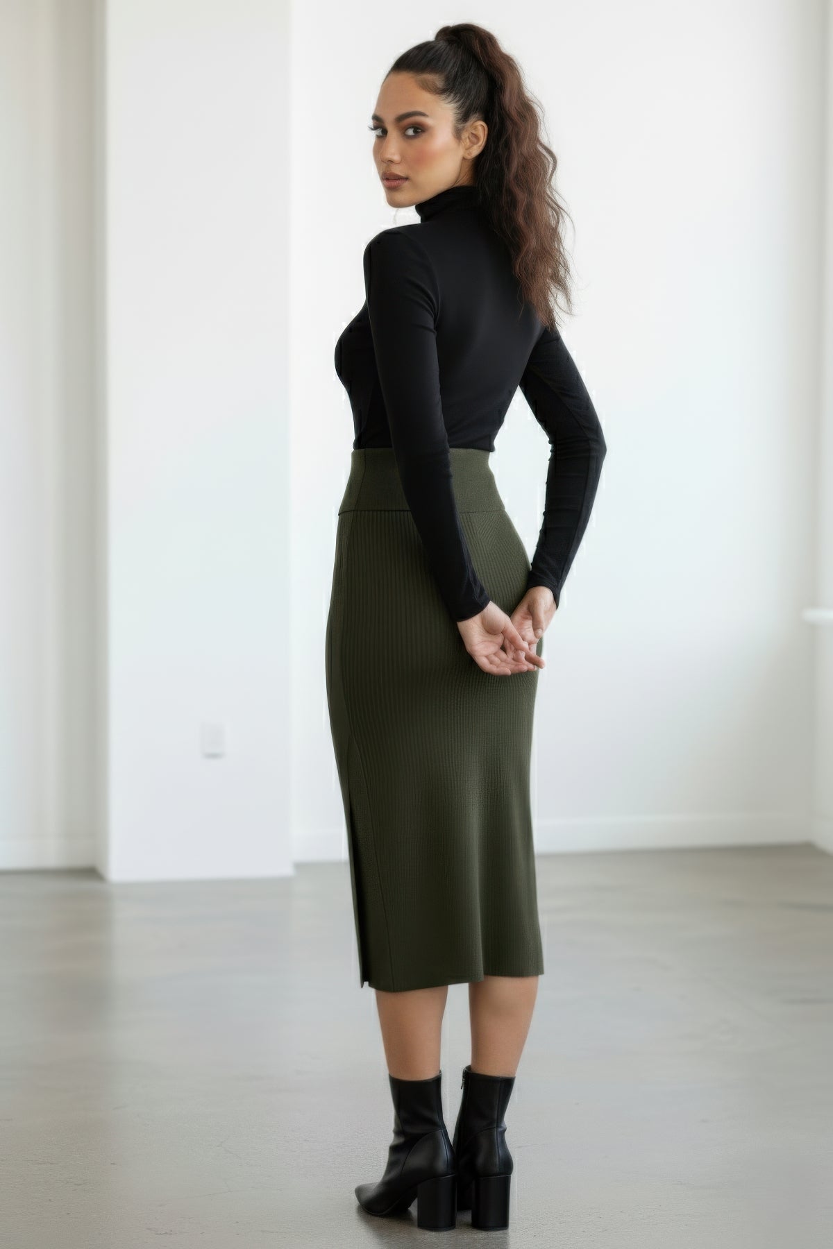 This ribbed knit midi skirt redefines effortless elegance. Designed with a flattering high waistband and side slit for just the right amount of edge, it hugs in all the right places while keeping things sleek and polished. Whether you pair it with a fitted turtleneck for a minimal-chic moment or an oversized sweater for a cozy balance, this skirt is your year-round go-to for timeless sophistication. From boardroom days to dinner nights style that moves with you.