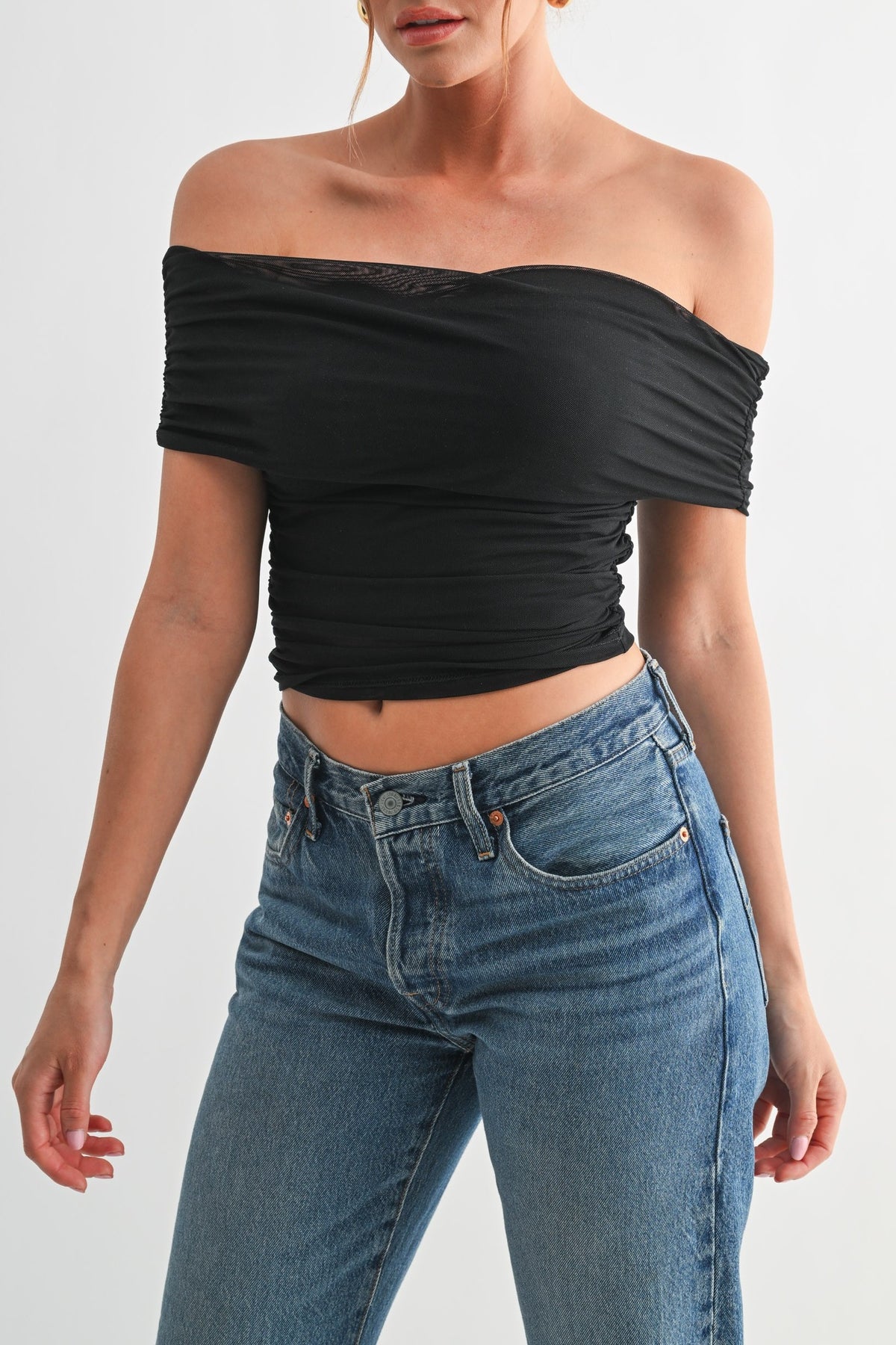 This off-shoulder black mesh top is the definition of effortless allure. Designed with soft ruched detailing that contours your shape and a sleek neckline that highlights your shoulders, it’s the perfect blend of minimal and sultry. The stretchy mesh overlay gives it a luxe, body-hugging fit while keeping it breathable and comfortable. Pair it with denim for a casual night out or high-waisted trousers for a dressier edge — either way, it’s a must-have piece that does all the talking.