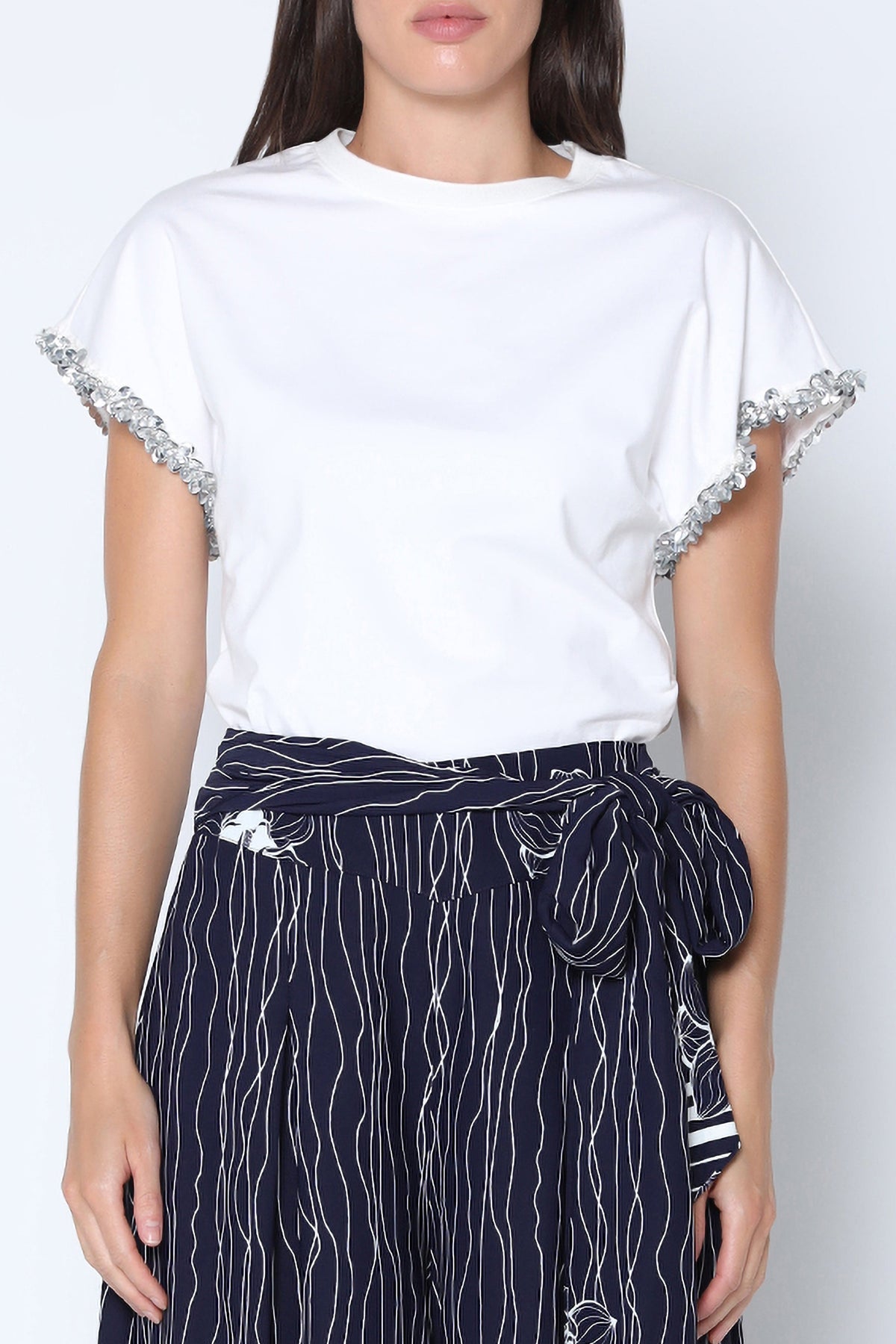 Who says basics have to be boring? This crisp white blouse adds a twist of glamour to your everyday look with silver-sequined fringe delicately trimming the sleeves. Crafted in a soft structured fabric with a relaxed silhouette, it’s the perfect blend of understated and eye-catching. Whether you’re styling it with tailored trousers or printed palazzos, this piece is your new go-to for effortless chic. Shine without shouting—this blouse makes it easy.